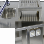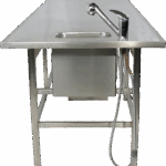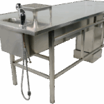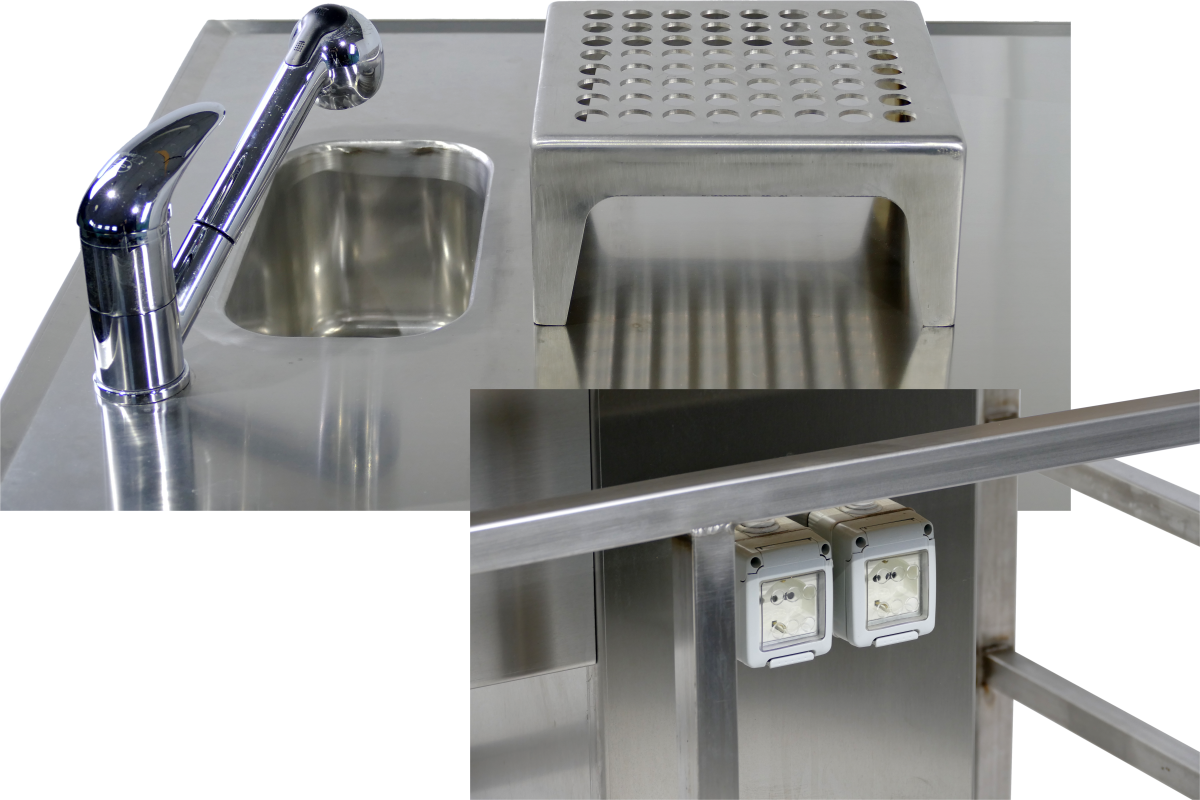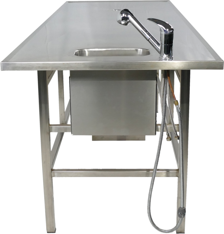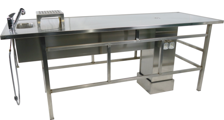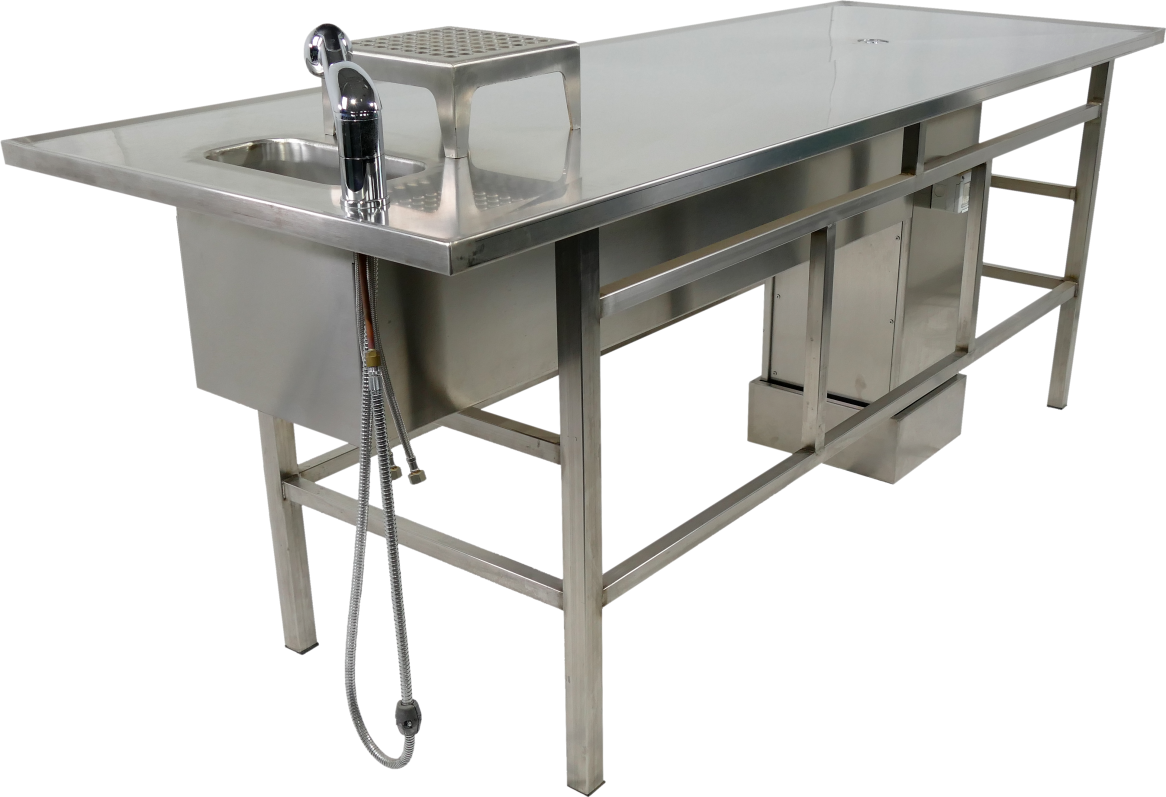Equipped with hot and cold water faucets and an extendable shower head, allowing for thorough washing of the body and the table itself.