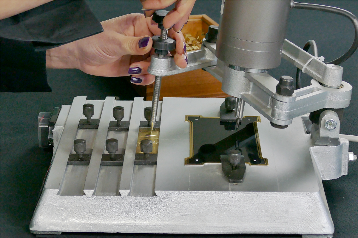 La profondità d'incisione è regolabile e il sistema di fissaggio garantisce che la targhetta rimanga salda durante il lavoro.